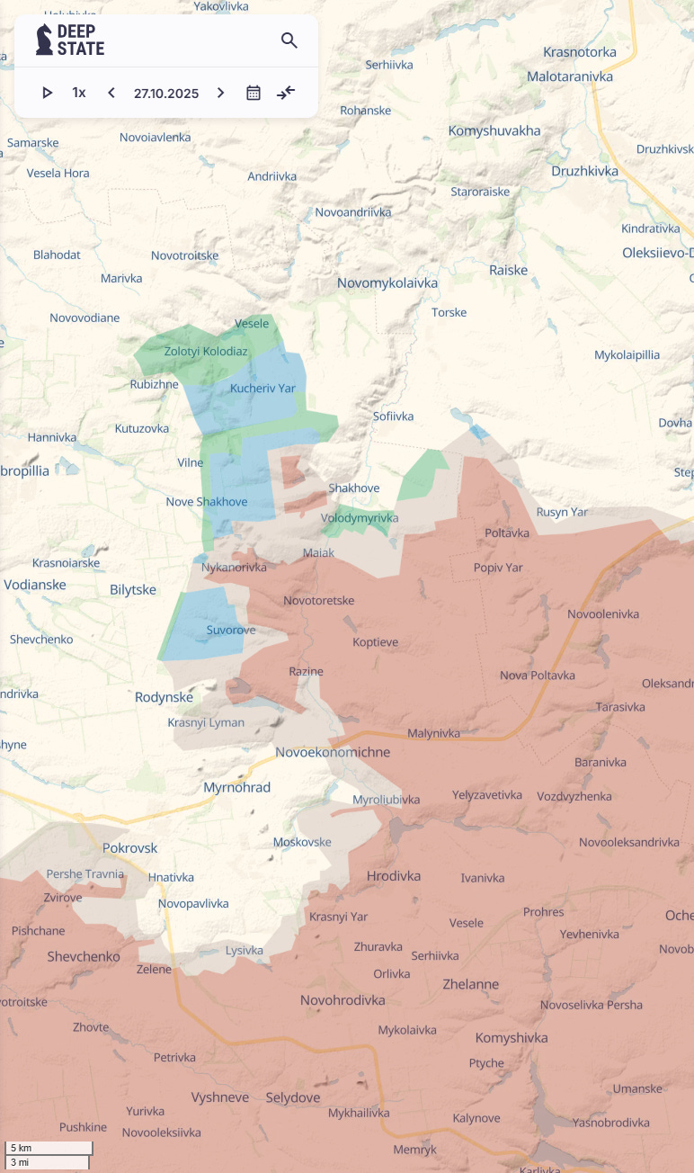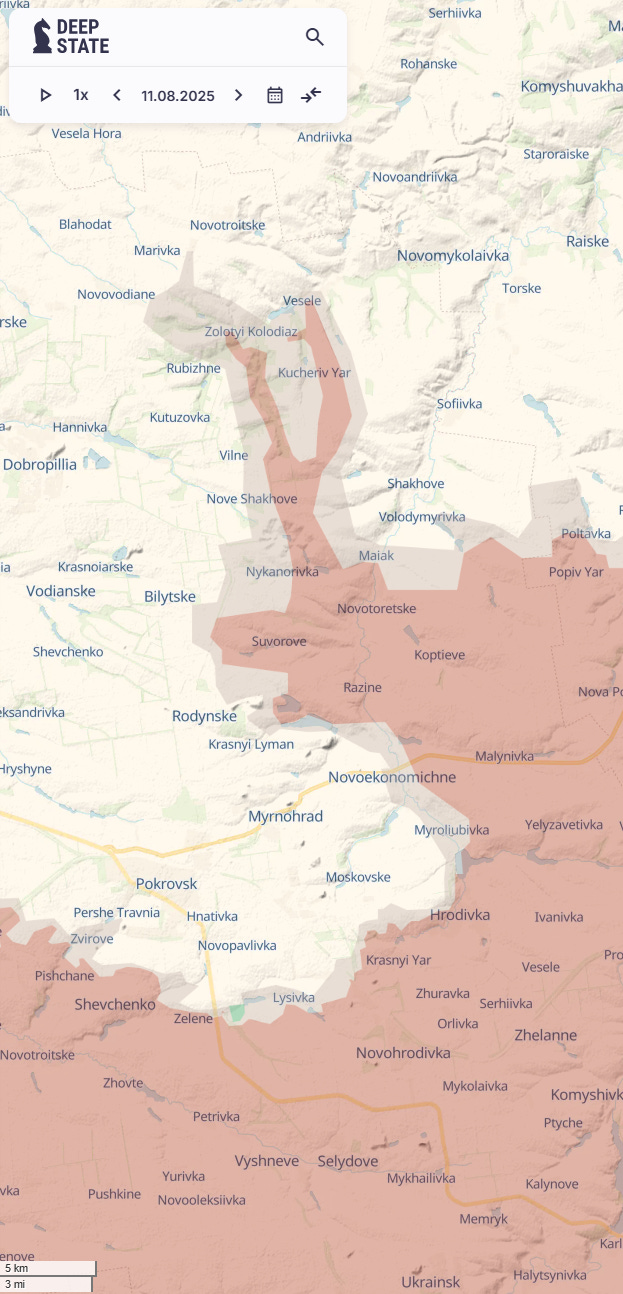 We have seen in the last four months the Ukrainians retake territory in a very different way than the Russians have taken it. Both north of Pokrovsk and recently around Kupiansk, the Ukrainians pushed the Russians back by 5-10 kilometres and not suffered terrible casualties. As a reminder here was the situation around Pokrovsk on 11 August. I will use the Deep State maps for below